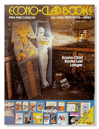 Cover for Econo-Clad Books catalog, a national book company: The Egyptian burial chamber with a mummy reading an Econo-Clad book was my crazy concept, which implied that Econo-Clad books could last over 4,000 years - the time of the pyramids. The design turned out to be a big production for a client with a small budget. We built the sarcophagus, painted the hieroglyphs, and mummified a fellow employee. We did the photoshoot in the ruins of an old rock building west of town. This was my first experience at art directing a photo shoot. As you can see by the props, we spared no expense! ❦