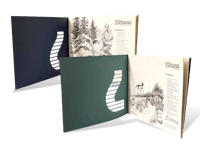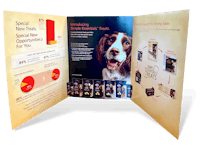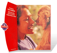 Hill’s Science Diet is a well-known premium specialty pet food brand that is sold throughout North America, mainly in pet retail stores and veterinarian clinics. This booklet was introducing the new “Healthy Defense System” product. The half-page red cover was cut out in an arch along with the logo. Notice the subtle image of a woman on the red cover. ↓