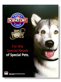 When I designed this national magazine ad for Hills Science Diet Treats, it had an extremely hot deadline. I was told there had not yet been a photo shoot of the product's entire line and wanted the ad produced like yesterday. So, they charged me with creating 3D illustrations to create the ad. Yay! This ad went in several national magazines, and it also won awards. ❦