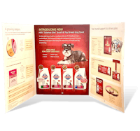 This is the Hill’s Science Diet merchandiser sales pamphlet for introducing the New Small Breeds dog food. It shows informative graphs, sales projections, and in-store promotional material. ↓