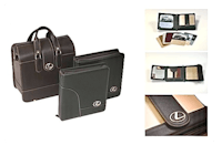 The two top halves of the leather case opened outward to reveal the contents. Inside were two leather portfolios, one for the interior trim and the other for the exterior trim. The case was for the Lexus sales associates to meet with prospective customers at their residence or place of employment. This project was a team effort and took several weeks to complete. We were very proud of the result, and won multiple awards. Toyota and Lexus were extremely pleased, too, and looked forward to us doing the next one. ❦