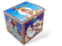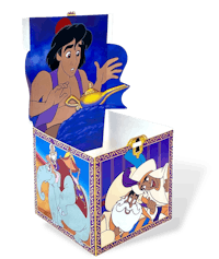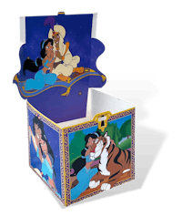 To release the pop-up Aladdin characters, pull the tab lock back, and they will pop up. It did need a little help, but all in all, it worked out pretty well, and it fit the storyline, a magical pop-up box, and a magical lamp. Okay, maybe that's a bit of a stretch. I think it kept the Targeteers amused. ↓
